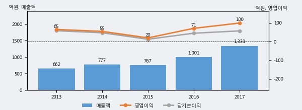 최근 실적을 살펴보면 2017년 매출액이 최근 5년 중 가장 높은 실적을 기록했음을 알 수 있다. 이전 최고 실적이었던 2016년 보다도 33.0%(330억 5천만원) 늘어난 것으로 나타났다.