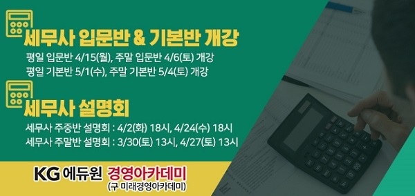 회계사 및 세무사를 전문으로 양성하는 'KG에듀원 경영아카데미(구 미래경영아카데미)'는 높아진 관심도에 부응해 올해 세무사 1차 시험 합격을 목표로 하는 수험생을 위한 마무리 대비반인 ‘하드캐리반’과 2020년 시험 합격을 목표로 하는 ‘세무사 기본완성종합반’을 준비했다.