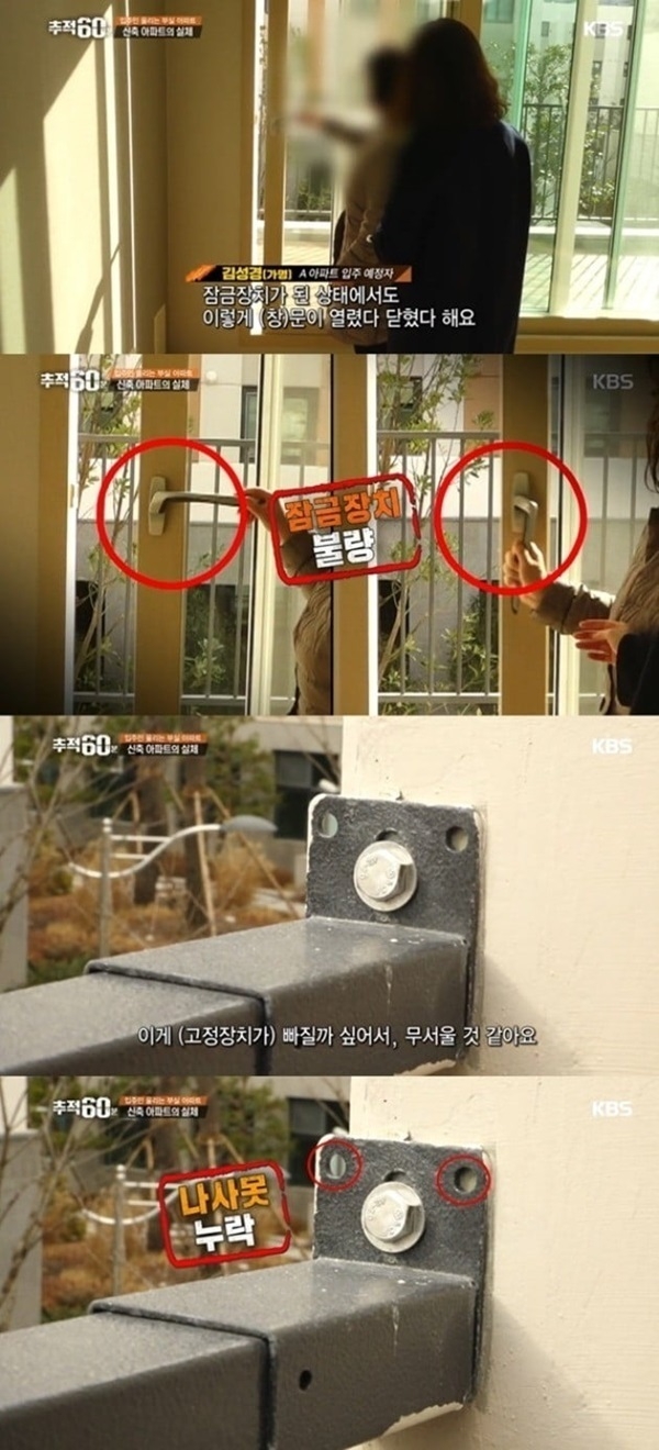 이날 분양자 A씨는 잠금장치를 걸어도 아무런 제지 없이 열리는 베란다 출입문, 나사못이 부족한 테라스 등 하자투성이 집안을 소개하며 분통을 터트렸다.