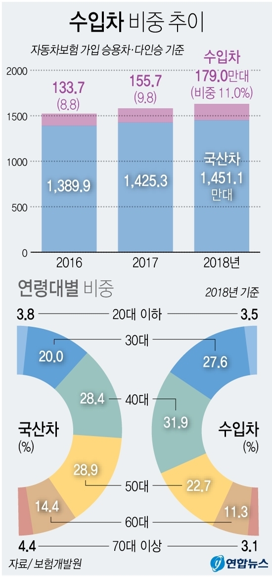 수입차 비중은 2016년 말 8.8%에서 2017년 말 9.8%, 지난해 말 11.0%로 해마다 커졌다.