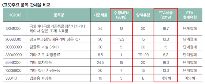 그 결과 기초화장품에 대한 올해의 FTA 협정세율은 5.2%로 협상 당시의 세율보다는 분명 1.3%나 인하된 관세율이다.