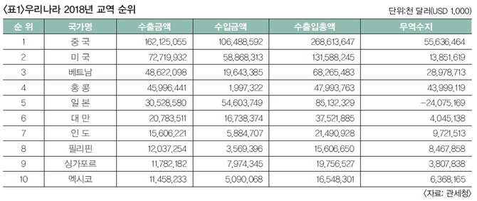 우리나라는 지난해 중국과의 교역에서 약 1620억 달러를 수출하여 556억 달러의 무역수지 흑자를 보았다. 이는 전체 수출액에서 약 27%를 차지하는 것으로 우리나라가 교역한 나라 중에서 단연 수위를 차지하고 있다. 홍콩의 수치까지 더한다면 그 비율은 훨씬 더 올라간다.