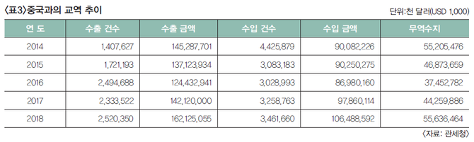 중국과의 교역량을 살펴보아도 2016년 사드 이슈로 살짝 꺾이긴 했으나 이듬해 바로 회복하여 신장을 하고 있음을 <표3>에서 확인할 수 있다.