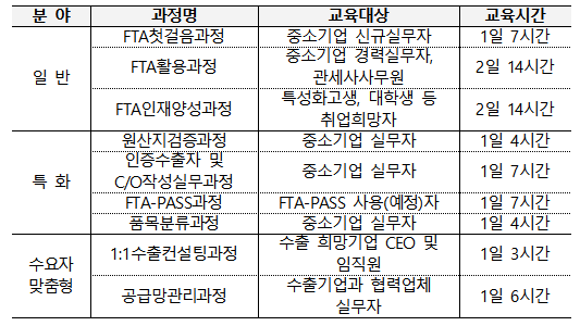 일반 교육과정에 수출입통관과 관세환급 내용을 추가해 FTA첫걸음과정을 신설했으며, 수요자맞춤형 교육과정도 FTA 활용 수출 상담을 추가해 1:1 수출컨설팅과정으로 개편했다.