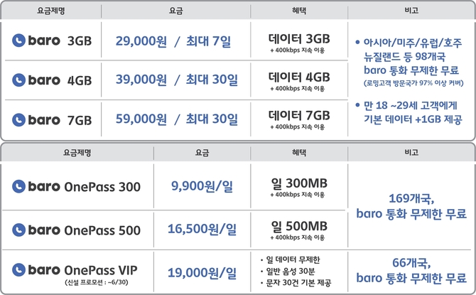 또 단기 여행객용 바로 원패스 300과 500은 각각 하루 9900원에 300MB, 1만6500원에 500MB의 데이터를 제공한다. 세계 거의 모든 국가에서 무료로 고품질의 음성 로밍 통화를 할 수 있는 바로 통화 혜택도 가능하다.
