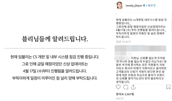 15일 임블리 측은 "당초 예정된 신상품은 17일 업데이트된다. 일정이 미뤄져 죄송하다"라는 공지글을 게재했다.
