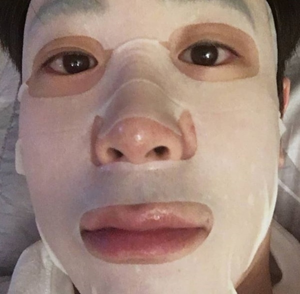 사진 속 피오는 얼굴에 마스크팩을 붙여 눈,코, 입만 드러낸 상태로 정면을 응시하고 있다.