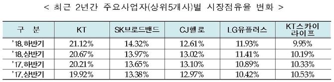 KT와 KT스카이라이프를 합하면 지난해 상반기(986만명)보다 24만명 늘어난 1010만명으로 집계됐다. 이에 따라 유료방송 시장에서 31.07%(시장점유율 0.22% 포인트↑)의 시장점유율을 차지했다.