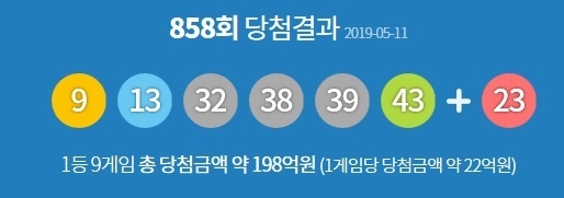 MBC가 11일 주관한 추첨식에서 로또 858회 1등 당첨번호가 9, 13, 32, 38, 39, 43으로 정해졌고 2등을 가리는 번호는 23이 뽑혔다.