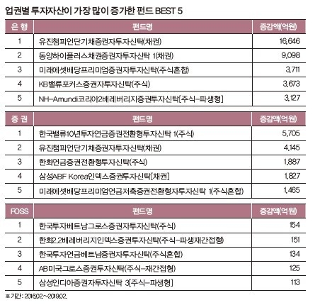 은행권에서 가장 많은 자금을 투자한 펀드는 유진챔피언단기채증권(채권), 동양하이플러스채권(채권), 미래에셋배당프리미엄(주식혼합) 펀드였고, 증권업권의 경우 한국밸류10년투자연금증권전환형1(주식), 유진챔피언단기채증권(채권), 한화연금증권전환형(주식)순으로 이어졌다.
