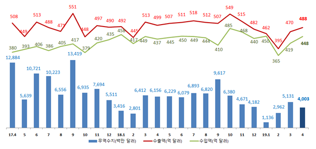 4월 무역수지는 40억 달러 흑자로, 지난 2012년 2월부터 87개월 연속 무역수지 흑자를 기록하고 있다.