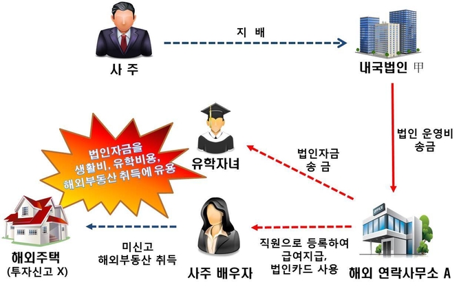 실제로 근무하지 않은 사주의 배우자를 해외 연락사무소 A의 직원으로 등록하여 인건비를 부당 지급하고, 배우자가 해외연락사무소 명의의 신영카드를 부당 사용한바 있다. 또 부당 유출된 법인자금과 사주가 국내에서 현금 증여(미신고)한 자금으로 사주의 배우자가 해외주택을 구입하고 미신고한 경우다.