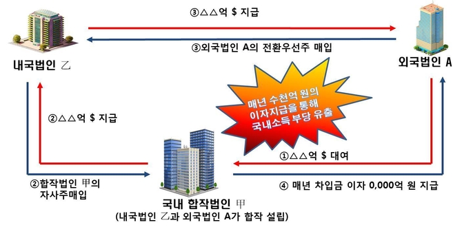 네 번째는 합작관계 정산을 위해서는 내국법인 을이 보유한 갑 주식과 외국법인 A주식을 맞교환하는 것이 합리적임에도 불구하고, 합작법인 갑은 외국법인 A로부터 수십억 달러의 자금을 차입하여 내국법인 을로부터 갑 주식을 매입, 소각하고 내국법인 을은 동일한 날짜에 갑 주식 매각대금으로 외국법인 A주식을 취득하는 비정상적인 거래방식을 선택, 자행했다. 합작법인 갑은 이후 매년 외국법인 A에게 이자비용 수천억원을 지급하여 합작법인 갑 소득을 해외로 부당유출한 것이다.