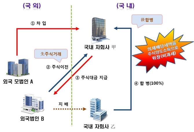 모법인 A의 국내 자회사 갑은 모법인 A로부터 주식인수 자금을 차입한 후 ‘선 주식인수 후 합병’이라는 인위적인 변칙거래를 통해 의제배당소득(원천세 대상)을 주식양도소득(비과세)으로 위장하였고, 조세조약상 주식양도소득은 거주지국 과세대상이라는 점을 이용하여 국내 조세부담을 회피하는 방식으로 합병거래를 완료함으로써 국내 조세부담을 회피한 사례이다.