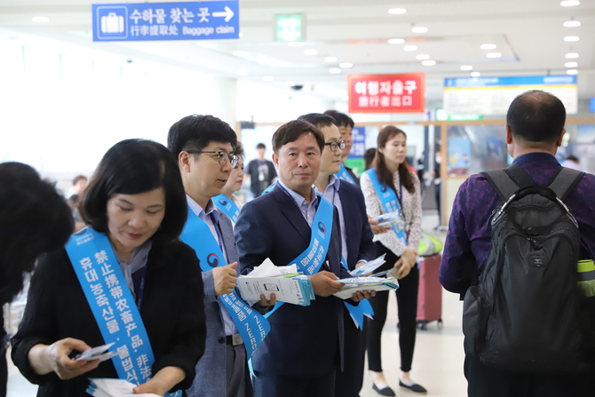 세관은 농립축산검역본부중부지역본부, 경인지방식품의약품안전청과 합동으로 17일 인천항 국제여객터미널에서 여행자들에게 불법물품 반입금지와 성실신고 안내문을 배포했다.