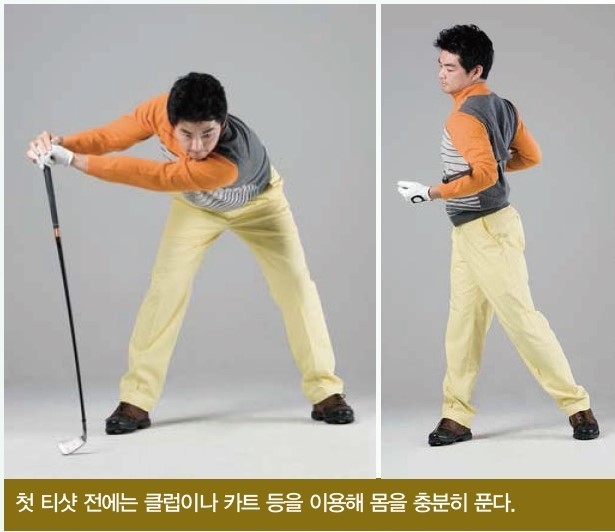 그런 후 허리와 어깨 근육 등을 천천히 풀어주도록 한다. 클럽이나 골프 카트 등을 이용해도 좋다. 모든 운동은 좌우를 번갈아 가며 한다. 클럽 선택도 중요하다. 티샷이라도 페어웨이 우드나 하이브리드 잡는 것을 고려할 수 있다. 거리에서 약간 손해를 보더라도 페어웨이에 볼을 안착시켜 자신감을 얻는 게 우선이다.
