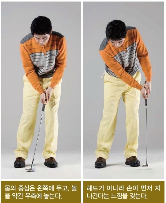 먼저 어드레스 자세에서 왼쪽에 중심을 두고 볼은 스탠스 가운데서 약간 우측에 둔다. 스트로크를 할 때는 손이 리드해야 한다. 헤드가 아니라 손이 먼저 지나간다는 느낌이다. 그러면 손목 꺾임 현상도 없어진다.