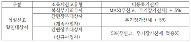 복식부기의무자에게 신고불성실 가산세와 무기장가산세 및 성실신고확인서 미제출가산세가 동시에 적용되는 경우 그 중 가장 큰 금액을 적용하였으나, 2018년부터는 성실신고확인서 미제출가산세를 신고불성실가산세 및 무기장가산세와 별도로 적용하도록 하였다.