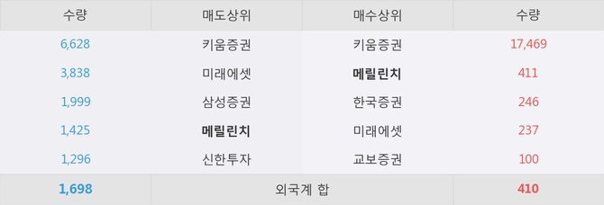 거래원 동향은 메릴린치, 미래에셋이 매수 상위 목록에 나타나고 있다. 한편, 매도 창구 상위에는 메릴린치가 눈에 띄고 있다.