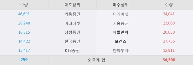 거래원 동향은 메릴린치, 모건스, 미래에셋 등이 매수 상위 목록에 위치하고 있다.