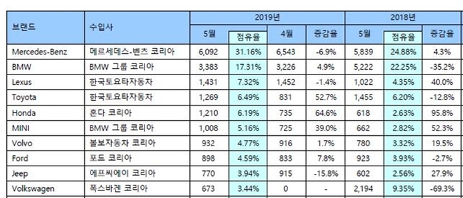 브랜드별로는 메르세데스-벤츠가 6092대 판매돼 지난달에도 1위를 유지했다. 벤츠의 수입차 시장 점유율은 31.1%를 기록했다.