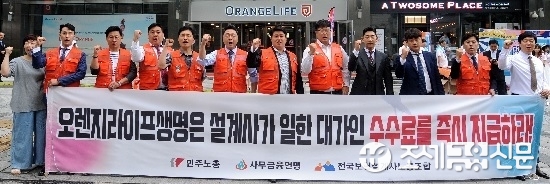 전국보험설계사 노조는 오렌지라이프생명에게 해촉된 지점장들을 규합, 사측의 강제 해촉과 이직후 수수수료 미지급 등을 규탄하는 집회를 개최했다.
