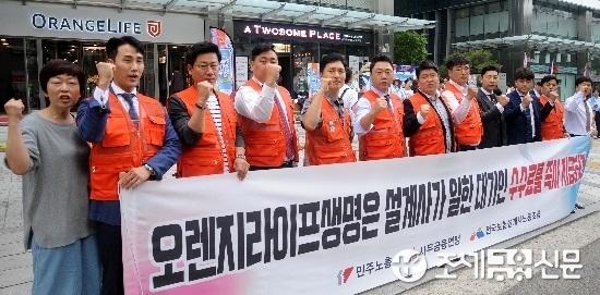 오세중 전국보험설계사 노조위원장은 "설계사는 노예가 아니며 정당한 설계사의 권리를 침해하는 오렌지라이프생명의 행위는 명백한 갑질이다"며 "오렌지라이프생명은 높고 훌륭한 본사 건물과 달리 설계사를 강제로 해촉하고 수수료를 미지급하는 추태를 멈춰야 한다"고 말했다.