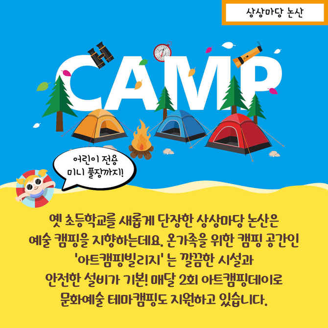 옛 초등학교를 새롭게 단장한 상상마당 논산은 예술 캠핑을 지향하는데요. 온가족을 위한 캠핑 공간인 '아트캠핑빌리지'는 깔끔한 시설과 안전한 설비가 기본! 매달 2회 아트캠핑데이로 문화예술 테마캠핑도 지원하고 있습니다.