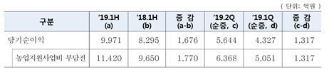 (조세금융신문=이학명 기자) 농협금융지주는 2019년 상반기 누적 당기순이익 9971억원을 기록했다고 26일 밝혔다. 이는 지난해 동기대비 20.2% 증가한 수치로 농협금융 출범 이후 사상 최대 실적이다.