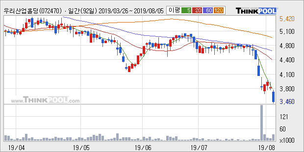 우리산업홀딩스의 2018년 매출액은 3870억으로 전년대비 16.3% 상승했고, 영업이익은 122억으로 전년대비 -27.6% 하락했다. 이 회사의 매출액 증감률과 영업이익 증감률은 각각 코스닥 상위 28%, 하위 39%에 해당된다.