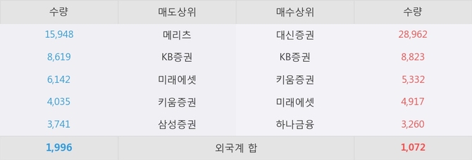 거래원 동향은 메리츠, 미래에셋, 삼성증권 등이 매도 상위 목록에 나타나고 있다.