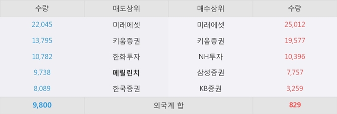 거래원 동향은 메릴린치, 미래에셋이 매도 상위 목록에 나타나고 있다.