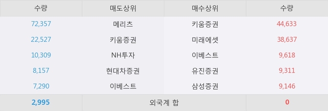 거래원 동향은 메리츠, NH투자 등이 매도 상위 목록에 나타나고 있다.