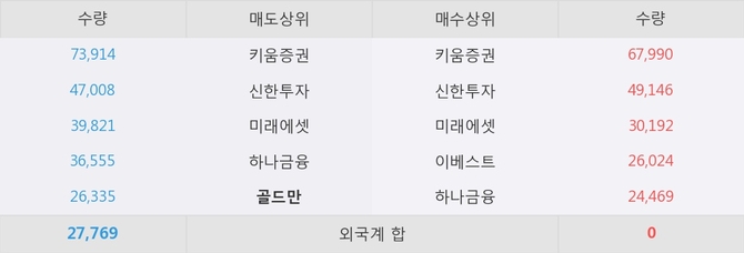 거래원 동향은 골드만, 미래에셋, 하나금융 등이 매도 상위 목록에 나타나고 있다.