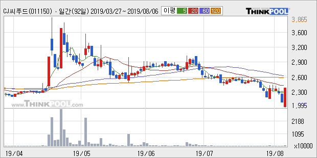 CJ씨푸드의 2018년 매출액은 1507억으로 전년대비 -8.5% 하락했고, 영업이익 역시 41억으로 전년대비 -37.0% 하락했다. 이 회사의 매출액 증감률과 영업이익 증감률은 각각 코스피 하위 15%, 하위 27%에 해당된다.