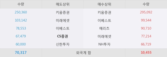 거래원 동향은 메리츠, 미래에셋, NH투자 등이 매수 상위 목록에 나타나고 있다. 한편, 매도 창구 상위에는 CS증권이 눈에 띄고 있다.