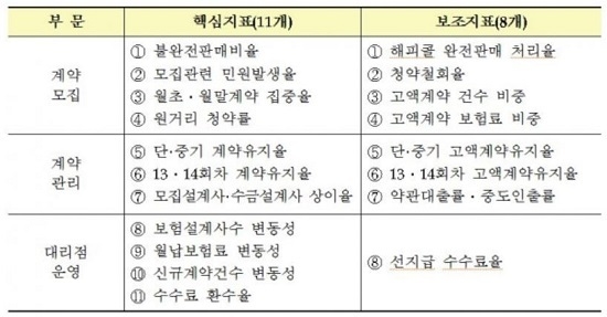 금감원은 GA별로 ▲계약모집 ▲계약관리 ▲대리점운영의 3개 부문에서 11개의 핵심지표와 8개의 보조지표를 선정, 이를 상대순위로 점수화해 평가하고 있다.