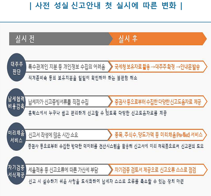 국세청은 이번 신고분부터 실질주주명부와 대법원 가족관계등록자료 등 국세청 보유자료를 활용해 상장주식 양도소득세 신고 대상 대주주를 정확하게 선정해 안내문을 발송한다.