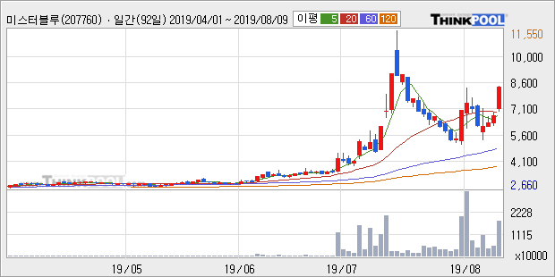 미스터블루의 2018년 매출액은 전년대비 2.7% 늘어난 310억원이고, 영업이익 또한 전년대비 9.1% 늘어난 40억원을 기록했다. 이 회사의 매출액 증감률과 영업이익 증감률은 각각 코스닥 하위 47%, 상위 39%에 해당된다.