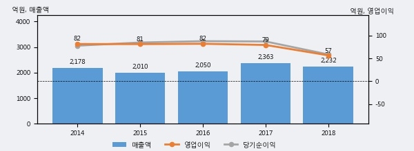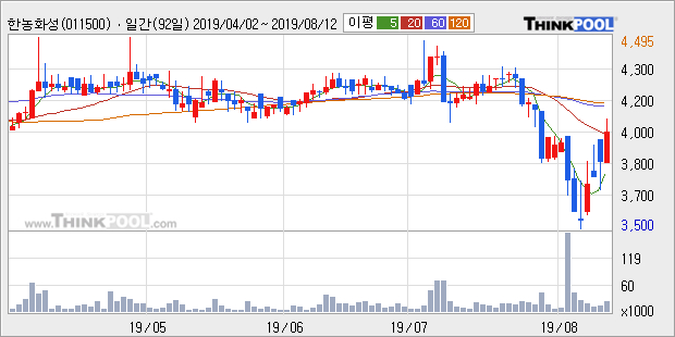 한농화성의 2018년 매출액은 2232억으로 전년대비 -5.5% 하락했고, 영업이익 역시 57억으로 전년대비 -28.6% 하락했다. 이 회사의 매출액 증감률과 영업이익 증감률은 각각 코스피 하위 19%, 하위 34%에 해당된다.