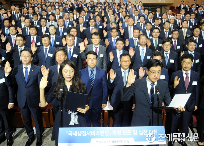 (조세금융신문=김용진 기자) 김현준 국세청장을 비롯한 국세청간부들이 12일 오전 정부세종청사 국세청에서 열린 전국 세무관서장 회의에서 국세행정 현장 서비스 현장 개정 선포 및 실천 다짐을 하고 있다.