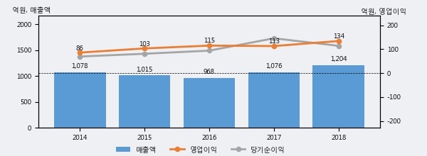 최근 실적을 살펴보면 2018년 매출액이 최근 5년 중 가장 높은 실적을 기록했음을 알 수 있다. 이전 최고 실적이었던 2014년 보다도 11.7%(126억 2천만원) 늘어난 것으로 나타났다.