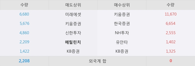 이 시각 주요 거래원은 NH투자, 키움증권, 한국증권 등이 매수 상위 창구에 자리하고 있다. 한편, 매도 창구 상위에는 메릴린치가 눈에 띄고 있다.