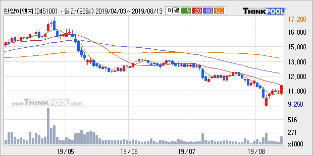 일봉 차트의 모습은 단기와 중기 모두 역배열 구간에서 하락 추세를 이어오다가 반등하는 모습이다. 이 종목의 차트에서 최근에 삼선전환도(양전환) 등을 확인할 수 있다