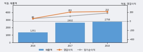 최근 실적을 살펴보면 2018년 매출액이 최근 3년 중 가장 높은 실적을 기록했음을 알 수 있다. 이전 최고 실적이었던 2017년 보다도 4.7%(123억 7천만원) 늘어난 것으로 나타났다.