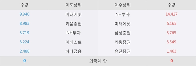 거래원 동향은 NH투자, 미래에셋, 삼성증권 등이 매수 상위 목록에 나타나고 있다.