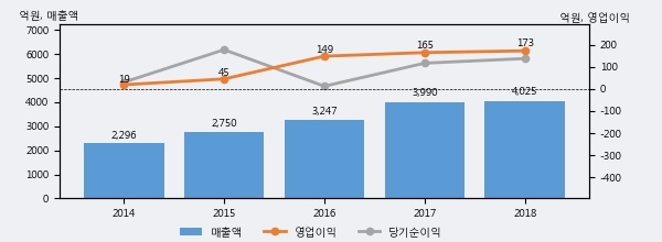 최근 3년간의 실적을 살펴보면 안정적 성장세를 보이고 있다. 최근 3년간 매출로 볼 때 매년 꾸준히 증가하고 있다. 다만 최근에 그 증가폭이 다소 감소하고 있다.