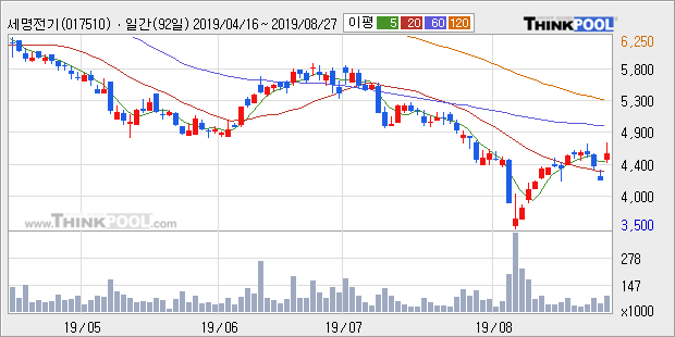 세명전기의 2018년 매출액은 190억으로 전년대비 -8.9% 하락했고, 영업이익 역시 33억으로 전년대비 -17.2% 하락했다. 이 회사의 매출액 증감률과 영업이익 증감률은 각각 코스닥 하위 25%, 하위 44%에 해당된다.
