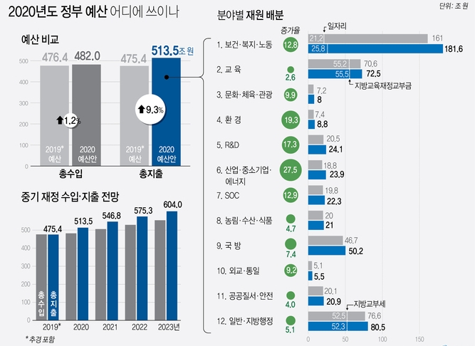 내년 정부 예산안이 올해보다 9.3% 늘어난 513조5000억원으로 확정됐다. 올해(9.7%)에 이어 2년째 9%대로 증액한 것은 경기 하방 위험에 대응하기 위해서다.