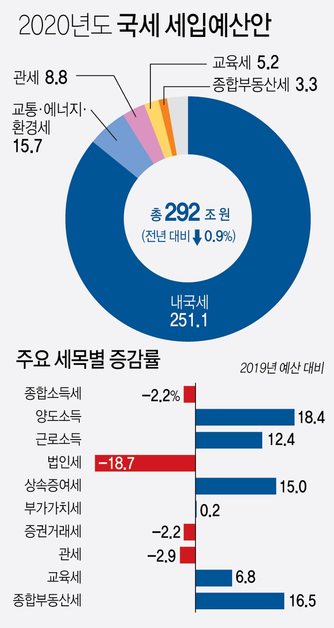 반면 내년 총수입은 482조원으로 1.2%(5.9조원) 증가하는 데 그칠 전망이다. 국세 수입이 올해 294.8조원에서 내년 292조원으로 0.9%(2.8조원) 줄면서 10년 만에 감소할 것으로 예상되는 데 따른 것이다.